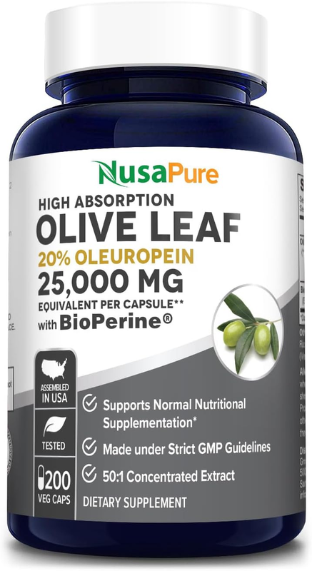 Brand | Nusapure Our formulations are crafted with care. Our beliefs and core values are to provide quality and innovative products. Our mission: Empowering people to live a happy life Olive Leaf 25,000mg - 20% Oleuropein - 200 Veggie Capsules Manufactured with a 50:1 extract delivering the equivalence of 25,000 mg of Olive leaves per capsule. 200 Capsules Per Bottle & a 200 Day Supply Vegetarian/Vegan, Non-GMO & Gluten Free Manufactured in the USA High Absorption formulation with Bioperine Standardized to contain 20% Oleuropein MANUFACTURED IN THE USA Made with Love All Nusapure supplements are made with love and care. Every single batch is carefully crafted. Family Owned and Operated From our family to yours - Thank you for being one of our cherished customers! 200 DAY SUPPLY 200 veggie capsules - 200 Day Supply VEGAN CAPSULES These Olive Leaf Extract capsules are 100% Vegan/vegetarian, NON-GMO, and Gluten-Free 25,000MG OLIVE LEAF PER CAPSULE FDA Disclaimer: These statements have not been evaluated by the Food and Drug Administration. This product is not intended to diagnose, treat, cure, or prevent any disease